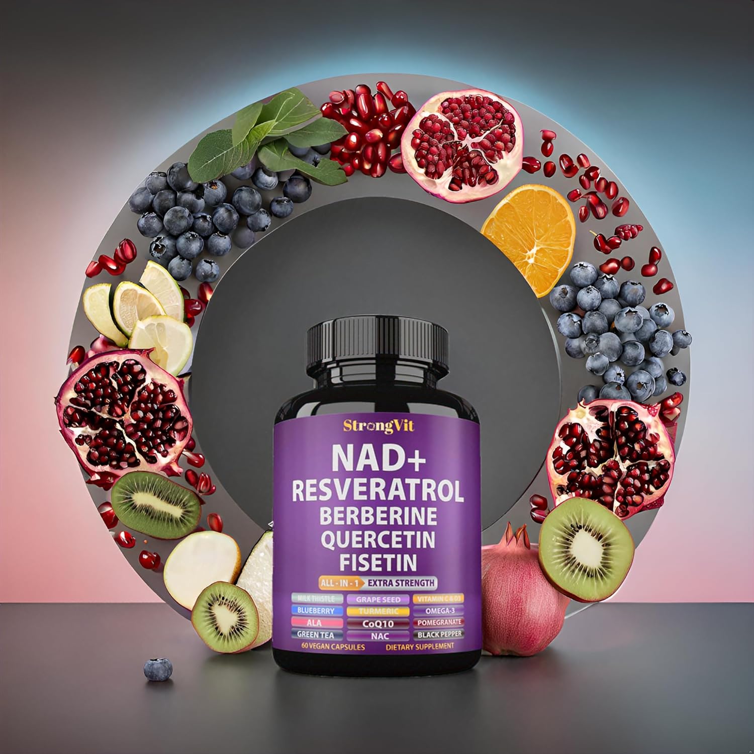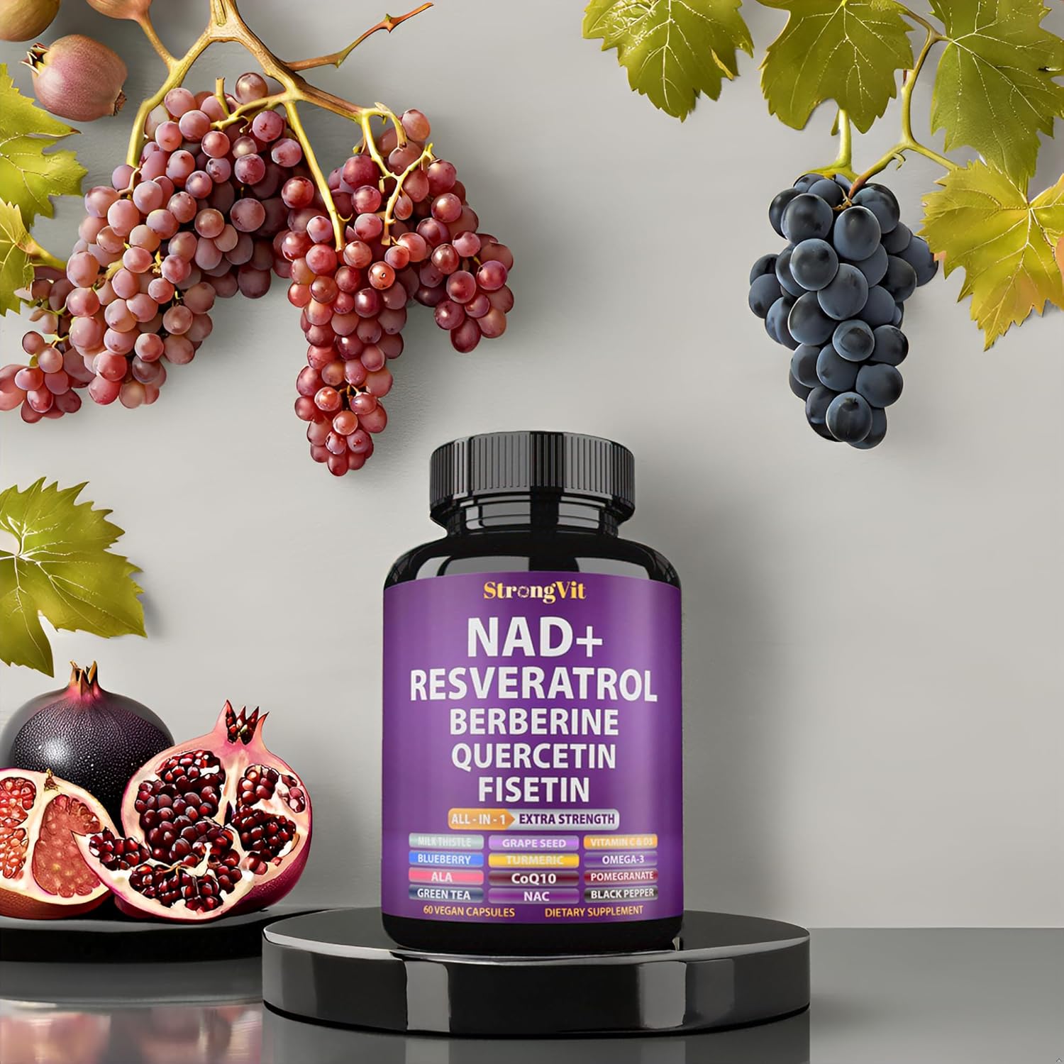 NAD+, Resveratrol, con Berberina, Quercetina, CoQ10, Fórmula 18 en 1, antienvejecimiento para mujeres y hombres, 60 cápsulas