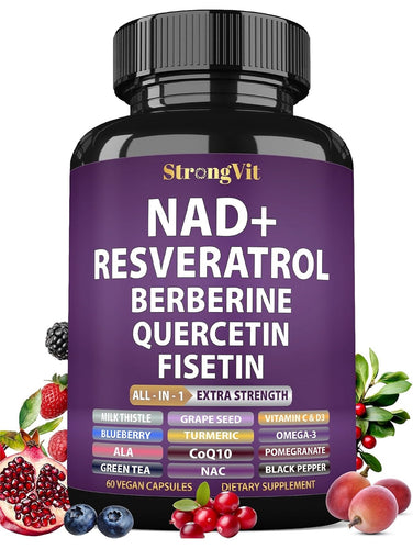 NAD+, Resveratrol, con Berberina, Quercetina, CoQ10, Fórmula 18 en 1, antienvejecimiento para mujeres y hombres, 60 cápsulas